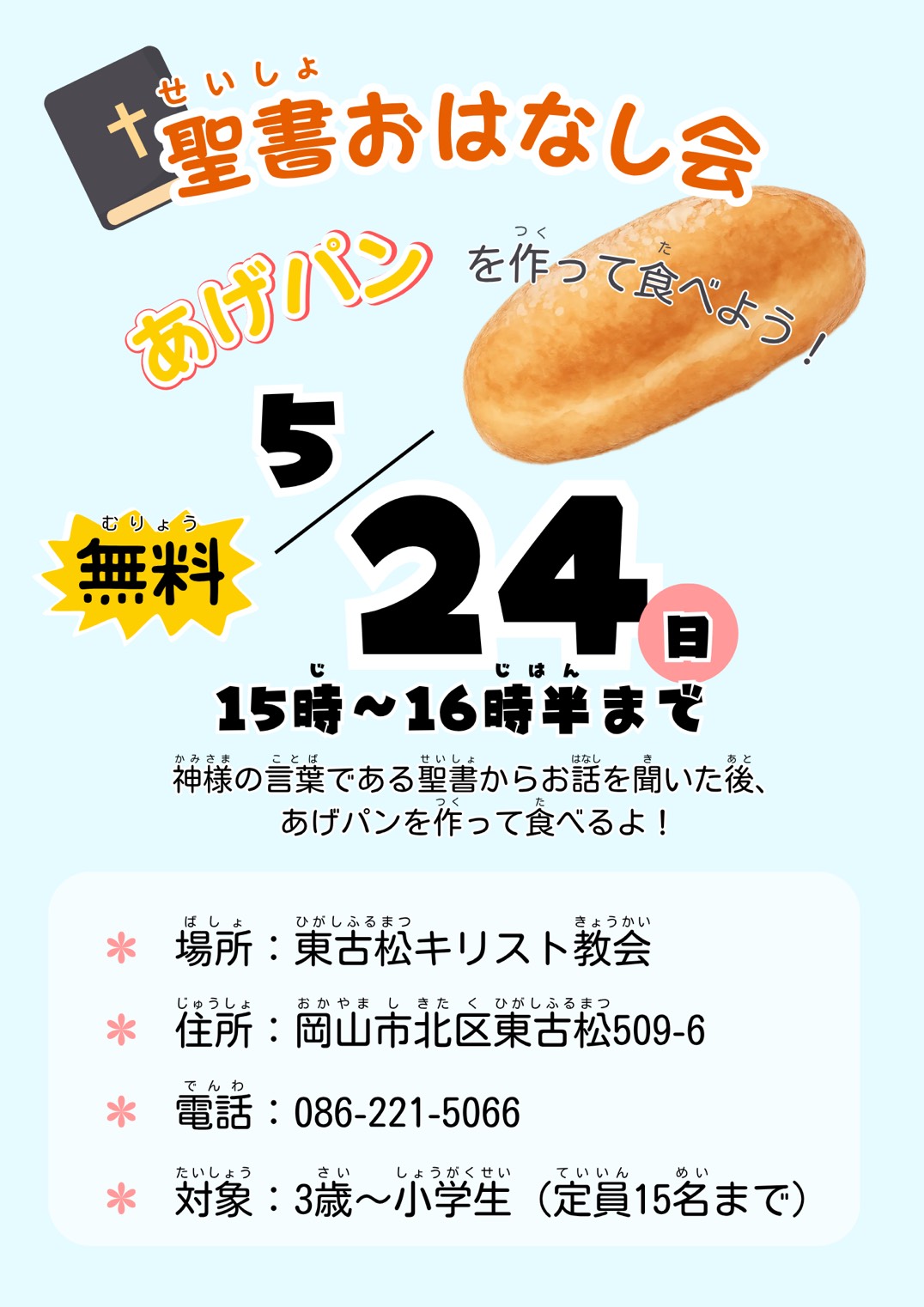 お伝えしたく企画いたしました。内容は、聖書からのメッセージを聞いた後、揚げパンをみんなで食べます。